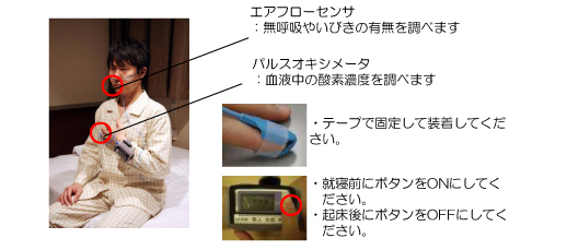 この検査では、指に体内の酸素濃度を調べるセンサーを、鼻と口に呼吸センサーを取り付けて検査を行います。